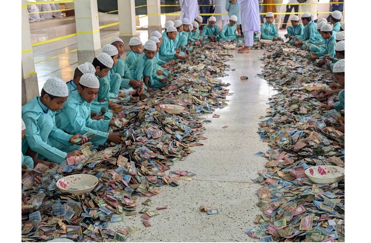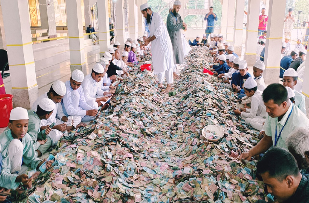 Volunteers sitting in rows carefully sorting piles of donated banknotes from the mosque donation boxes.