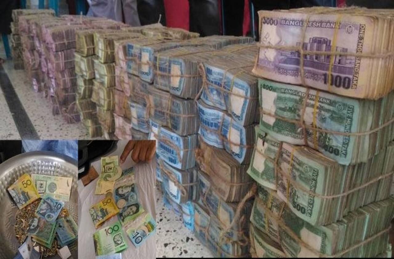 A massive heap of mixed currency notes being sorted by rows of people inside the mosque premises.