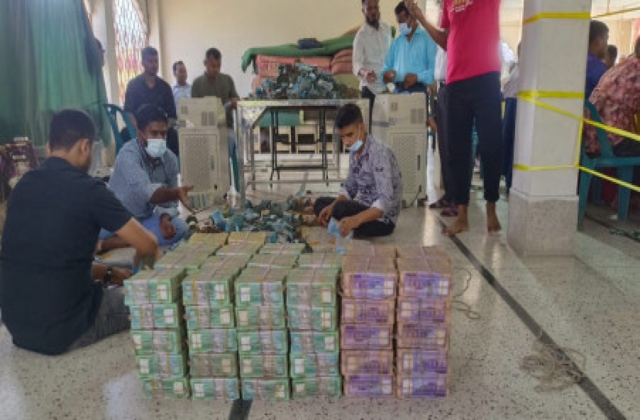 Workers recording and stacking the neatly wrapped bundles of sorted donation money.